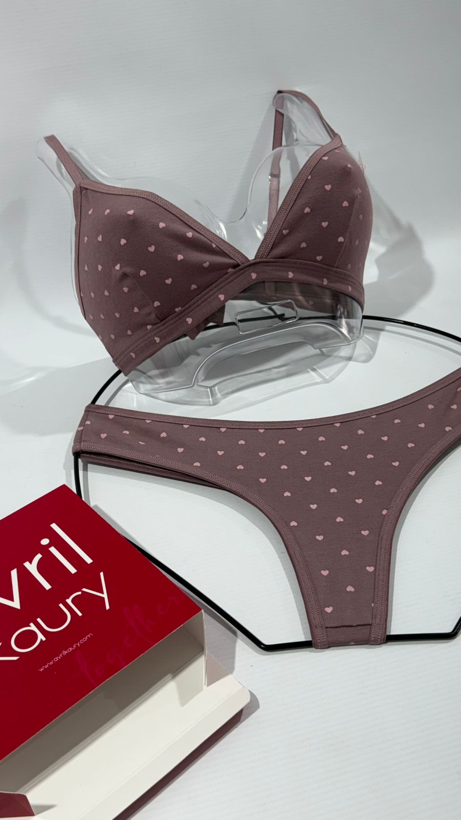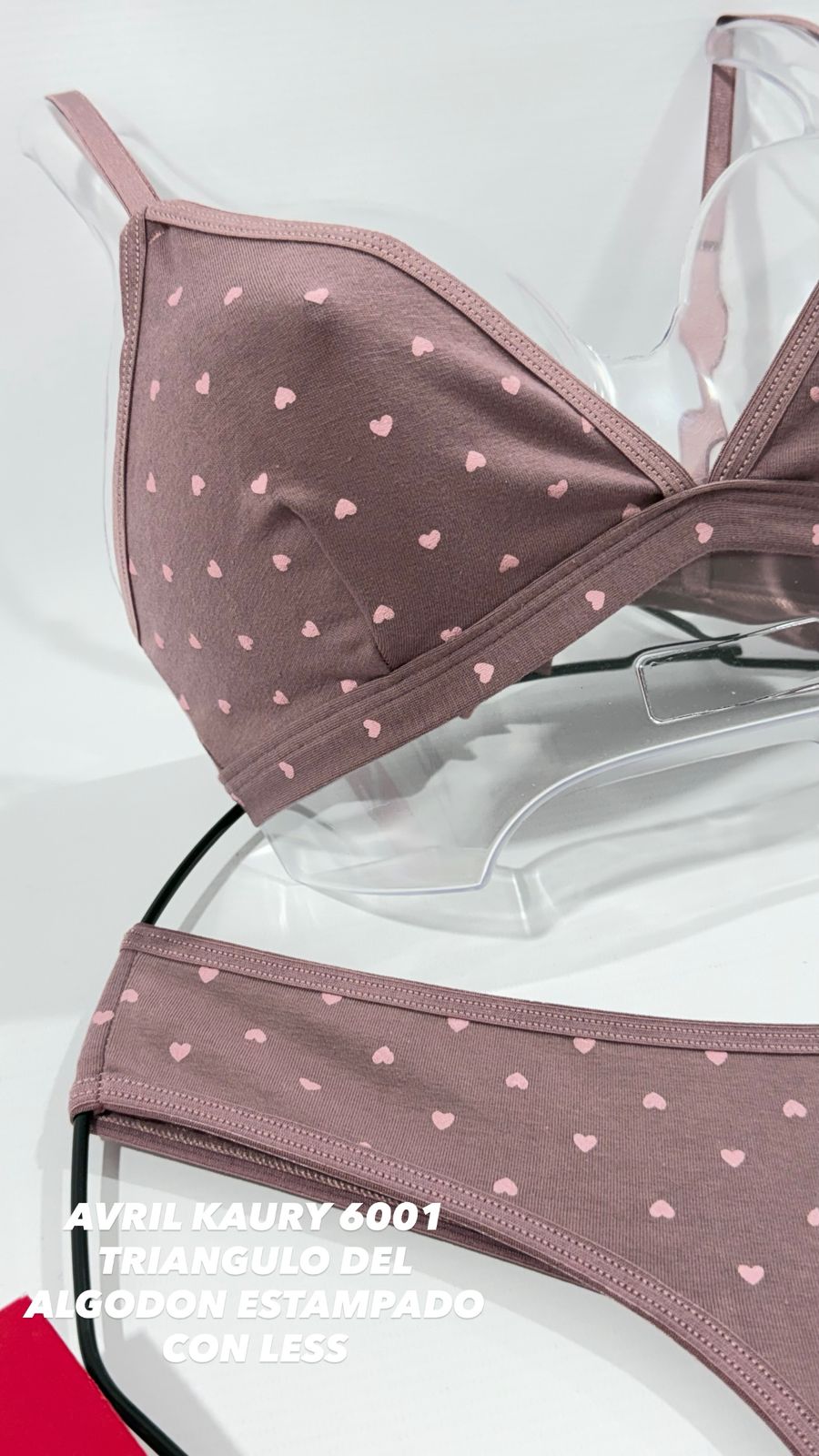 Conjunto de algodón estampado mini corazones. Corpiño triangulito y cola less.