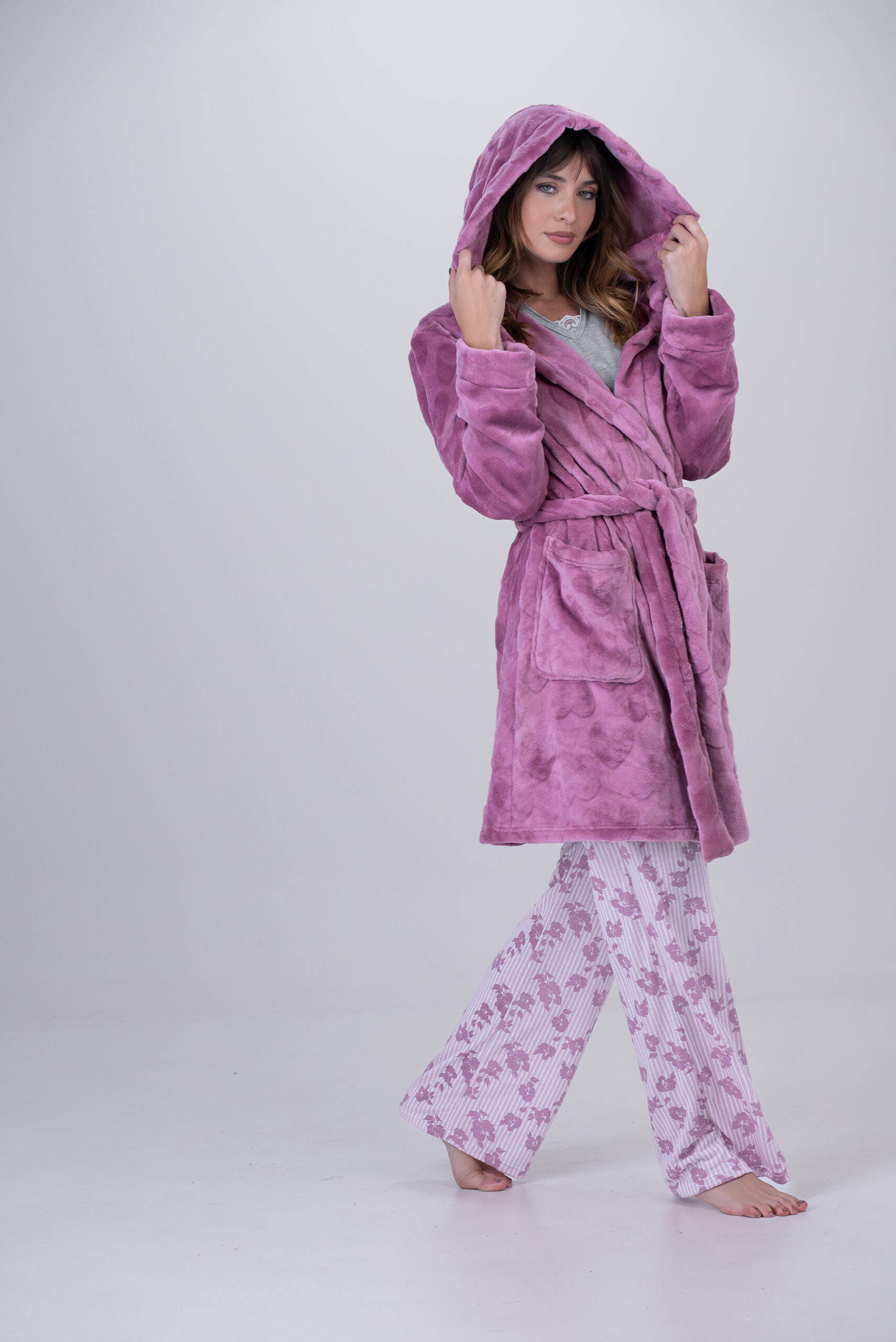 Bata pelo largo suave con textura de corazones.