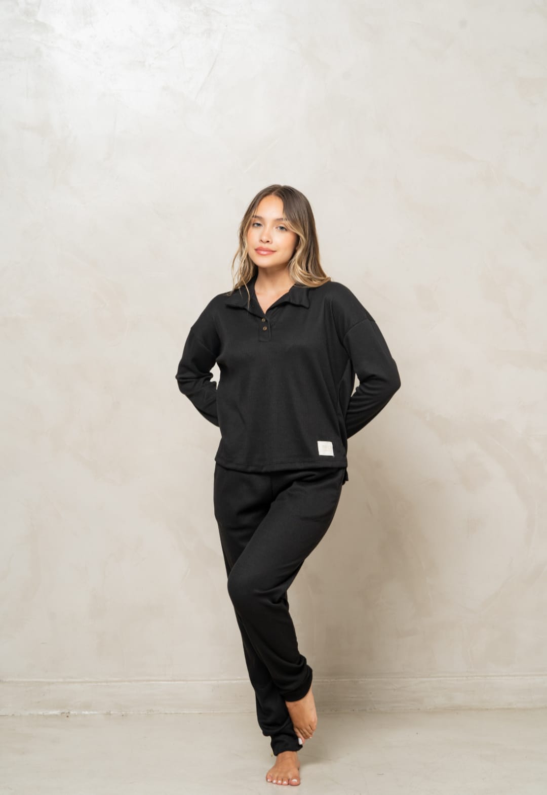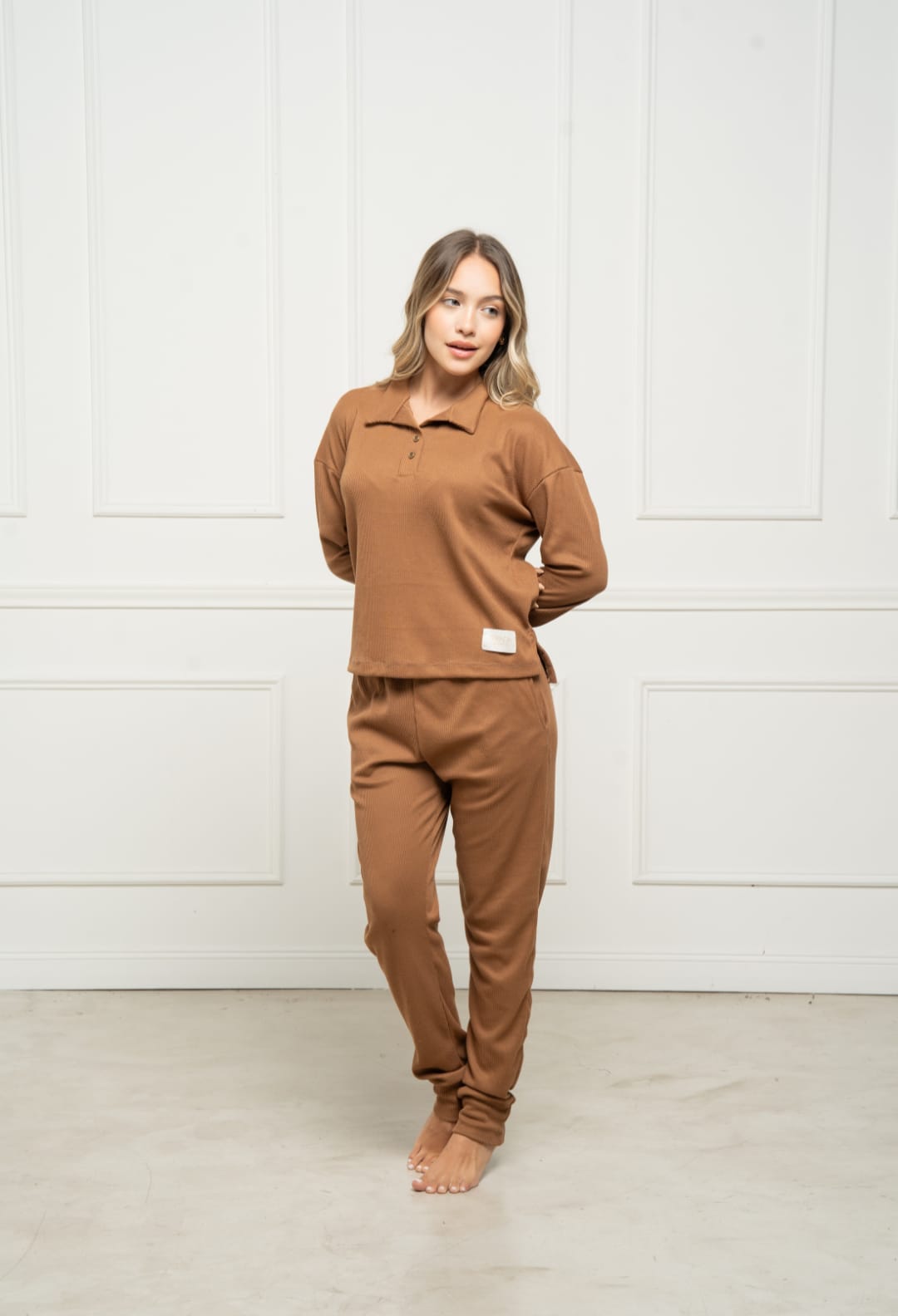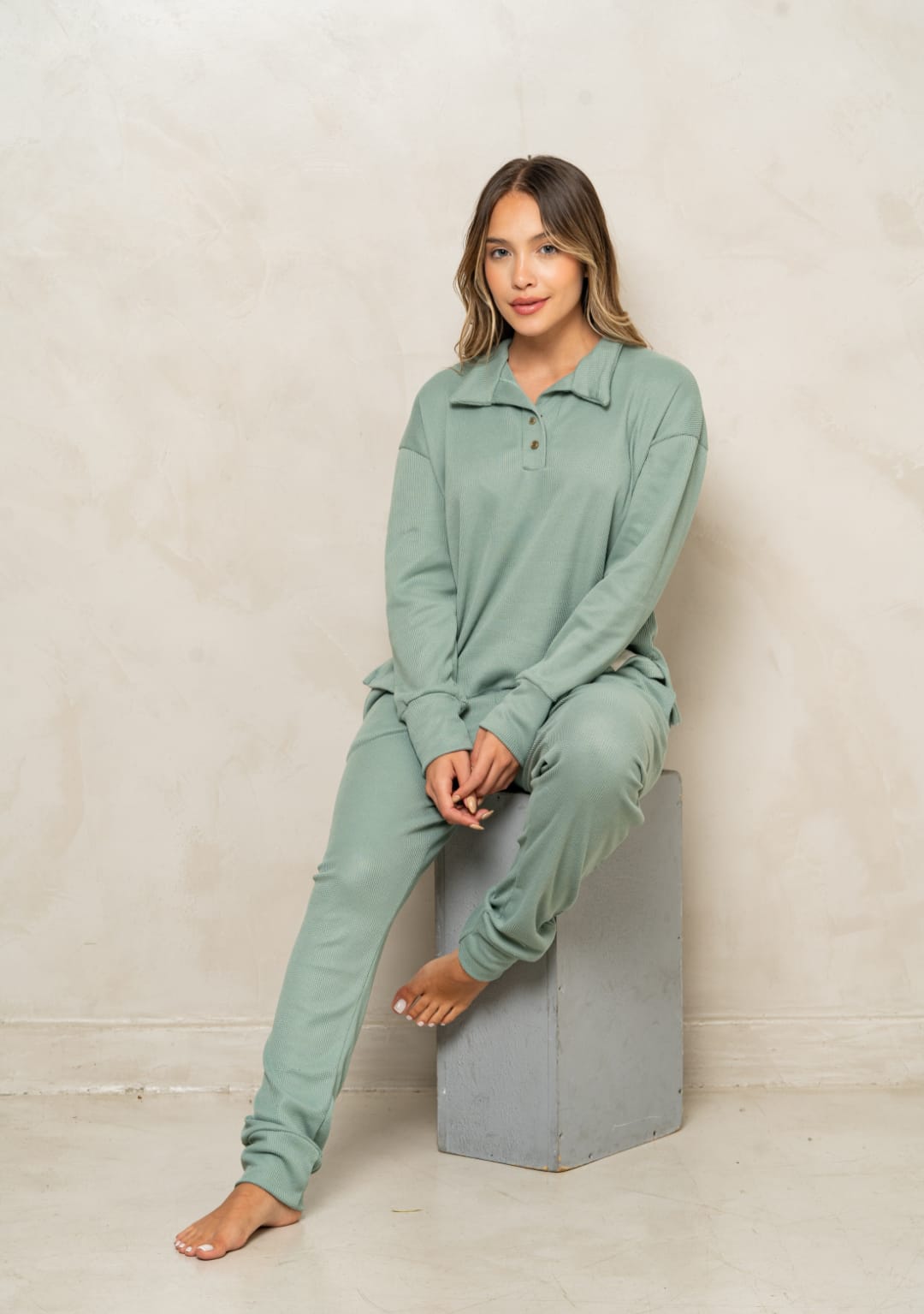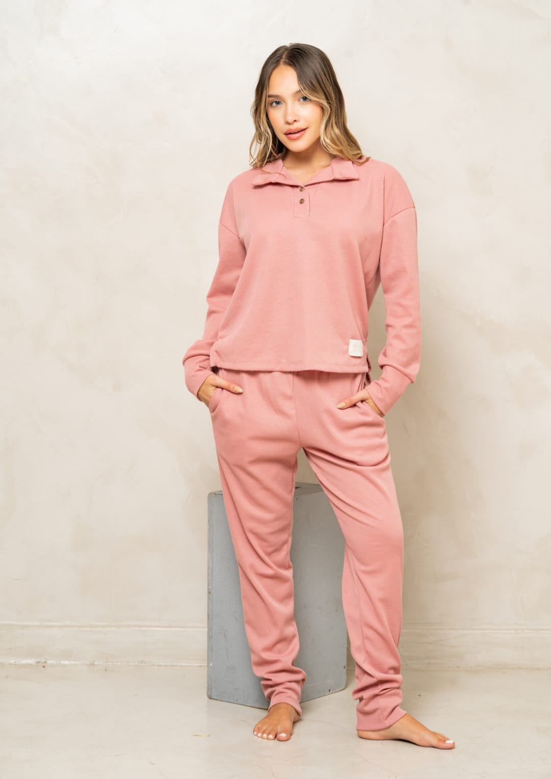 TRENDA 5607 SET PIJAMA REMERA POLO Y PANTALON WAFFLE